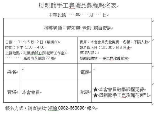一年一度偉大的母親節即將來臨囉~理事長黃老師貼心的為會員們開一堂母親節禮品-手工皂玫瑰花束教學 ..希望能給母親一份心意...黃老師親自授課喔!因要統計人數預備材料..請盡早報名..謝謝