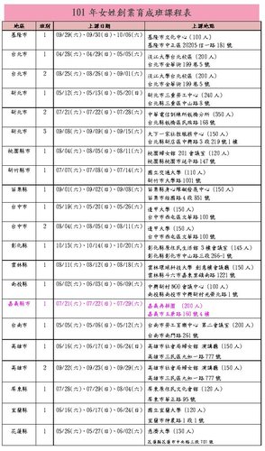 為幫助已創業或準備創業的女性充實相關知能,本會規劃一系列基礎創業課程,包括:創業評估與風險管理、創業準備與商機、創業資金與財務規劃、創業計畫書撰寫等課程,並安排各領域成功創業家、專業師資進行意見交流,今年在北、中、南、東四區共開辦21班次,每班次課程3天,都在週六、日! 行,相關報名資訊可上網http://www.careernet.org.tw/womennow/ ) 查詢。