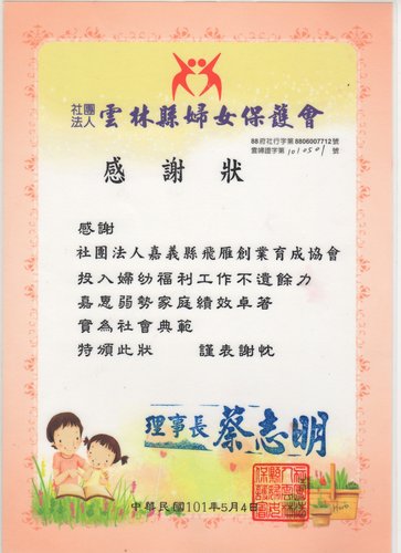 嘉義縣飛雁創業育成協會自100.12.18成立以來,提供婦女學習創業技能,並輔導將所學回饋社會,熱心公益,嘉惠大眾及弱勢團體。此次「嘉義縣飛雁創業育成協會」與「嘉義家扶中心」合作,辦理「創皂希望工作坊」,讓弱勢兒童及青少年,從製作手工香皂中,體驗社會關懷之互動,讓充滿愛心的香味飄溢,散播社會的各個角落。
