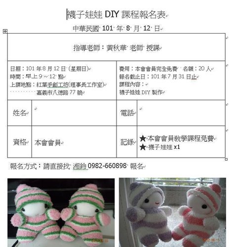 8月份新課程~襪子娃娃DIY..可愛的小飾品喔...歡迎報名..速度要快喔!!名額暫預訂20人..7/31日截止有使用網路的姐妹們..請互相告知其它姐妹..謝謝
